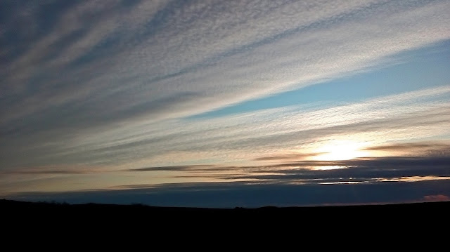 High streaky cloud formations created a dramatic sunrise over Bartinney Down early AM just as a fine female fox briefly breaks cover in the low light to hunt for voles in the rough grass fields.
